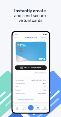 Key features: • Instantly create and send virtual cards from your PNC Corporate Card • Set spending limits, active dates, and more • Assign reference codes and upload attachments for better expense management • Get real-time updates on spending activity and know who’s spending what and where • Streamline expense processes and automate reconciliation