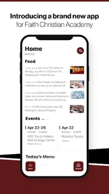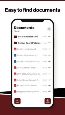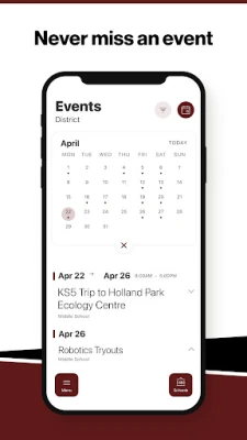 NEVER MISS AN EVENT The event section shows a list of events throughout the district. Users can add an event to their calendar to share the event with friends and family with one tap.